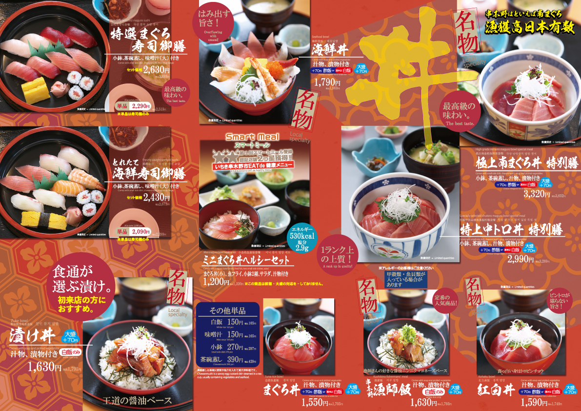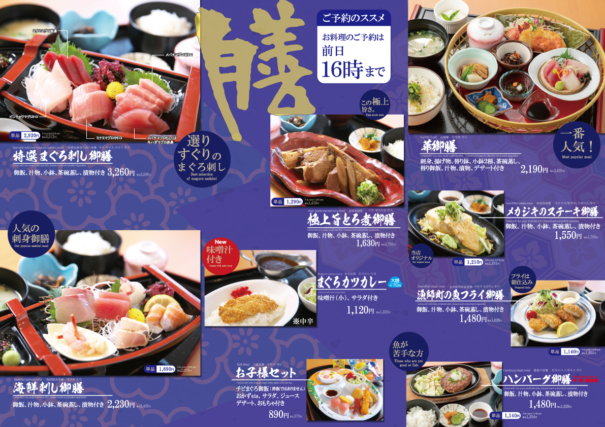 マグロを名一杯食べたい方は「特選まぐろ刺し御膳」。新鮮な魚介を楽しみたい時には「海鮮刺し御膳」