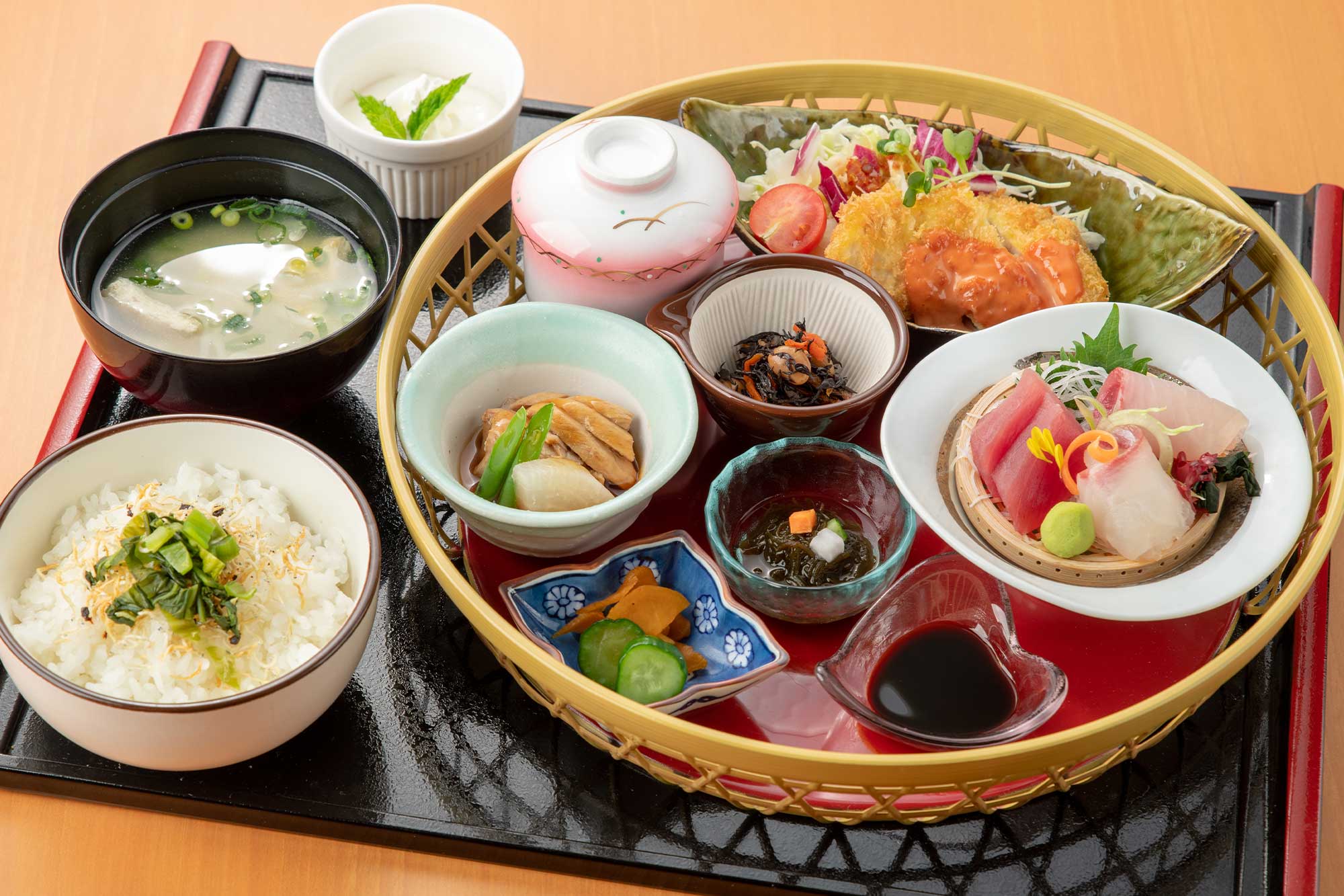 ミニお造り、替り揚げ、小鉢2種、替り鉢、茶碗蒸し、替り御飯、汁物、香の物、デザート付き